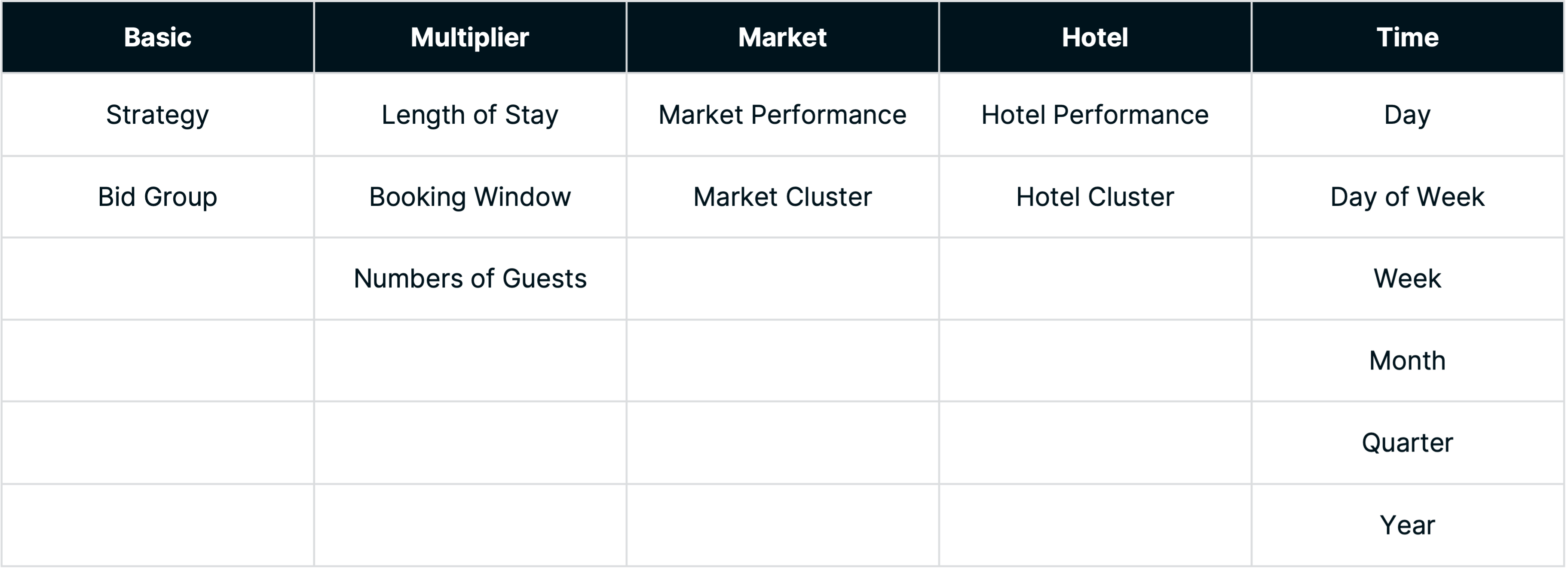 We provide  5 categories and 17 pre-defined reports to view the performance from different perspectives.