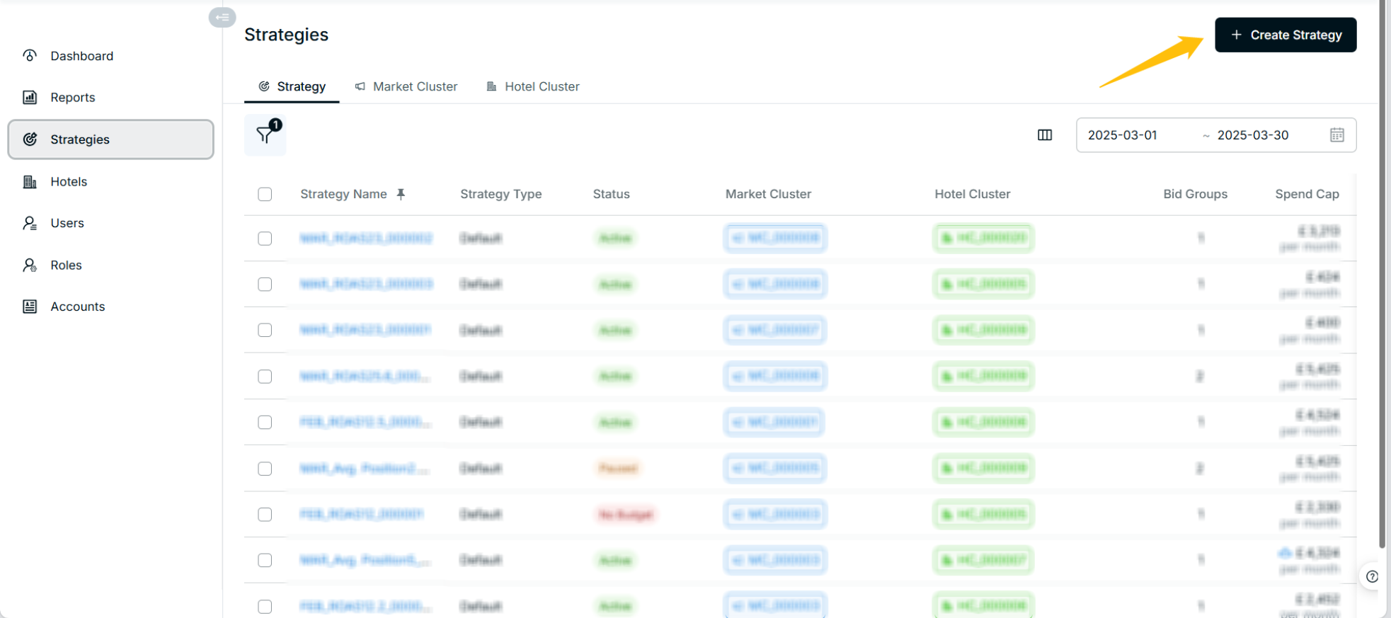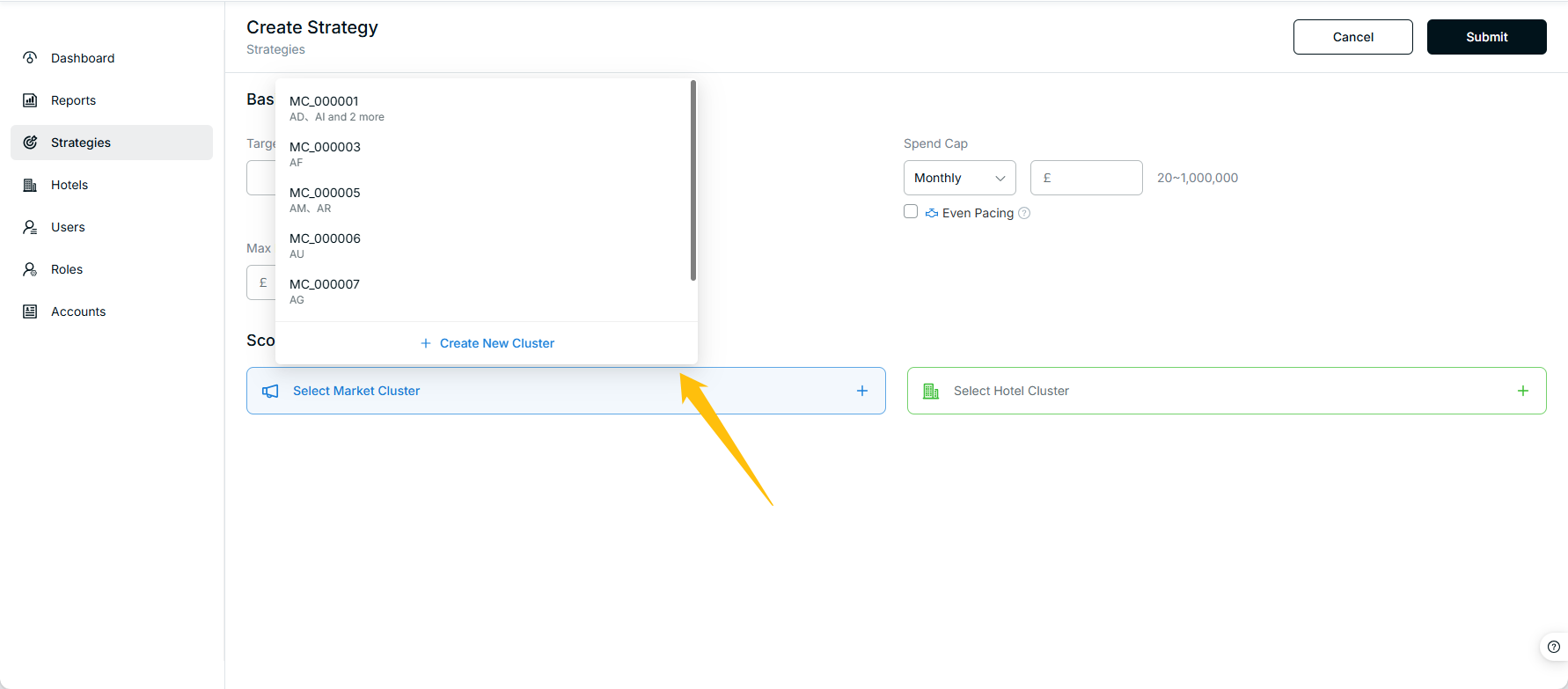a. Each Market Cluster or Hotel Cluster can be applied to a maximum of 10 strategies b. Markets within a Market Cluster must not overlap; for example, you cannot create one Market Cluster with US, CN and another with US, CA c. Each Hotel can be applied with a maximum of 10 Hotel Clusters d. Users cannot create strategies with overlapping scopes (Hotel Cluster + Market Cluster) with existing strategies