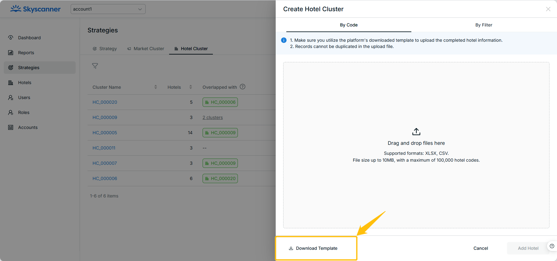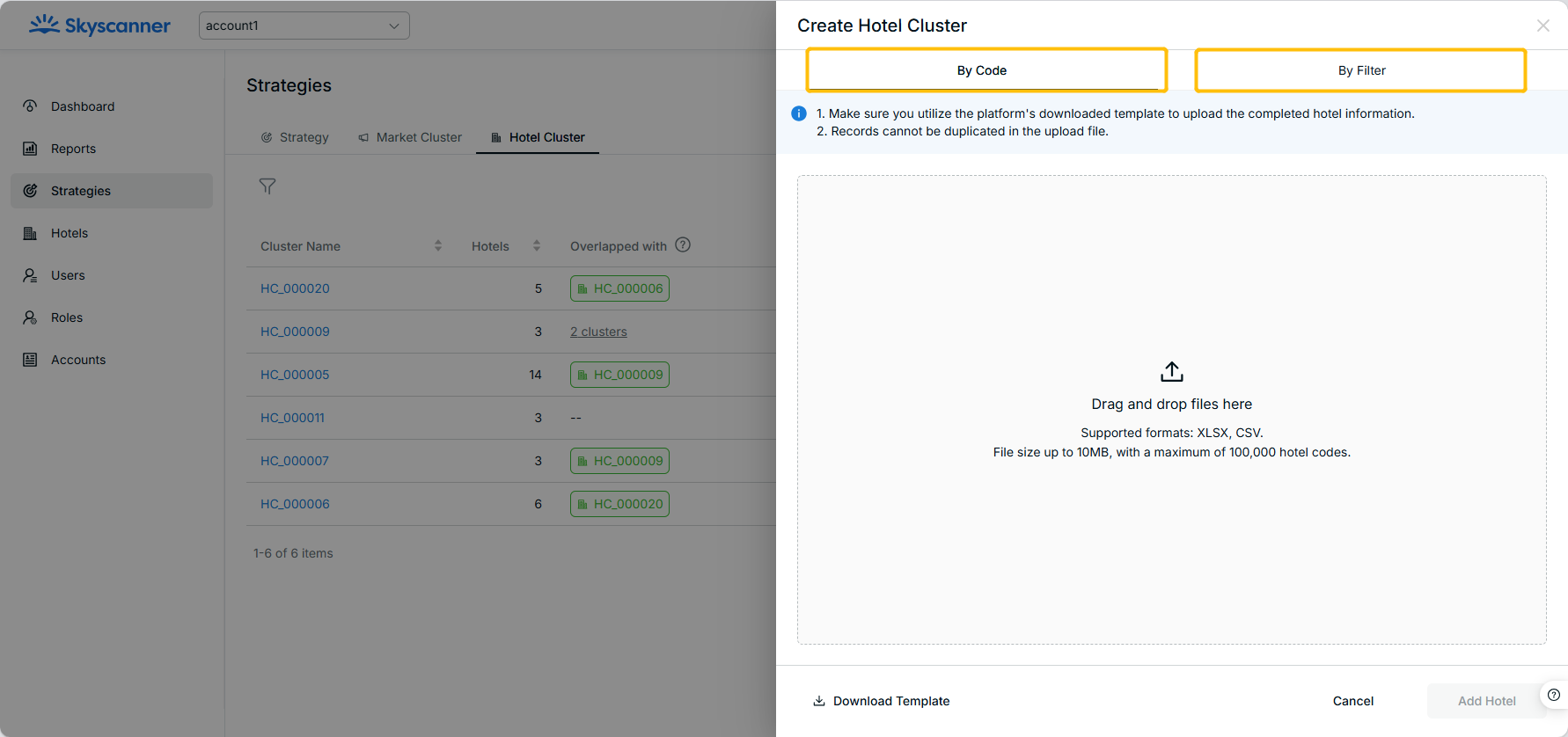 - Create Hotel Clustersby either submitting a file with Hotel Codes or using filters.