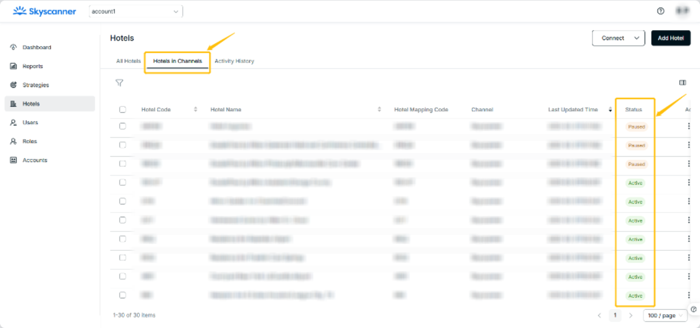 - Please make sure that you have bound all the hotels, which you want to use in the strategy, to the Skyscanner channel and the status is active.