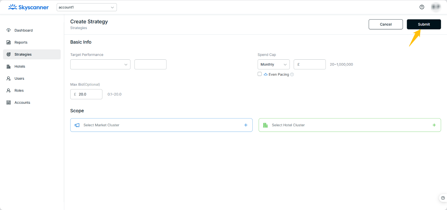 - After confirming all the target performance, market cluster, and hotel cluster settings, click Submit.