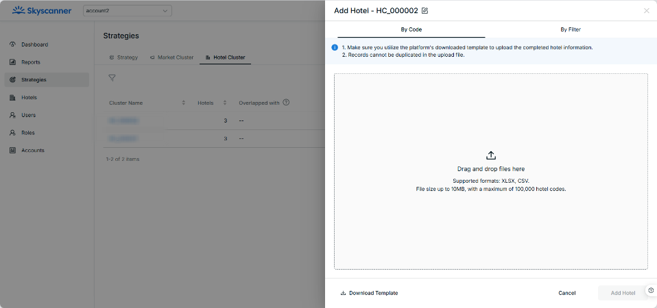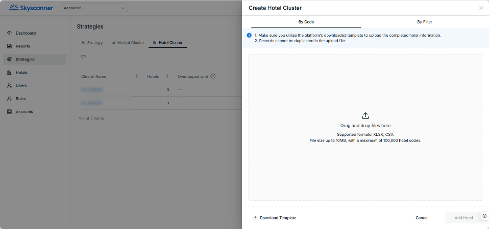 - By Code: users can upload a hotel code file (either xlsx or csv) to create a hotel cluster. A max of 100,000 hotel codes at one file