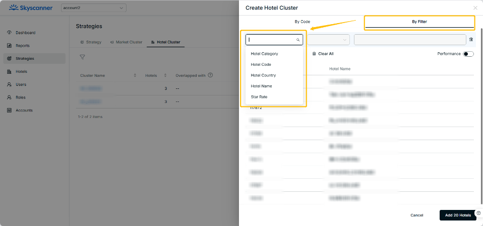 - By Filter with Performance OFF: users can apply filters to select specific hotels for creating a hotel cluster. Please be aware that our default filters do not support Performance metrics such as Bookings and Clicks