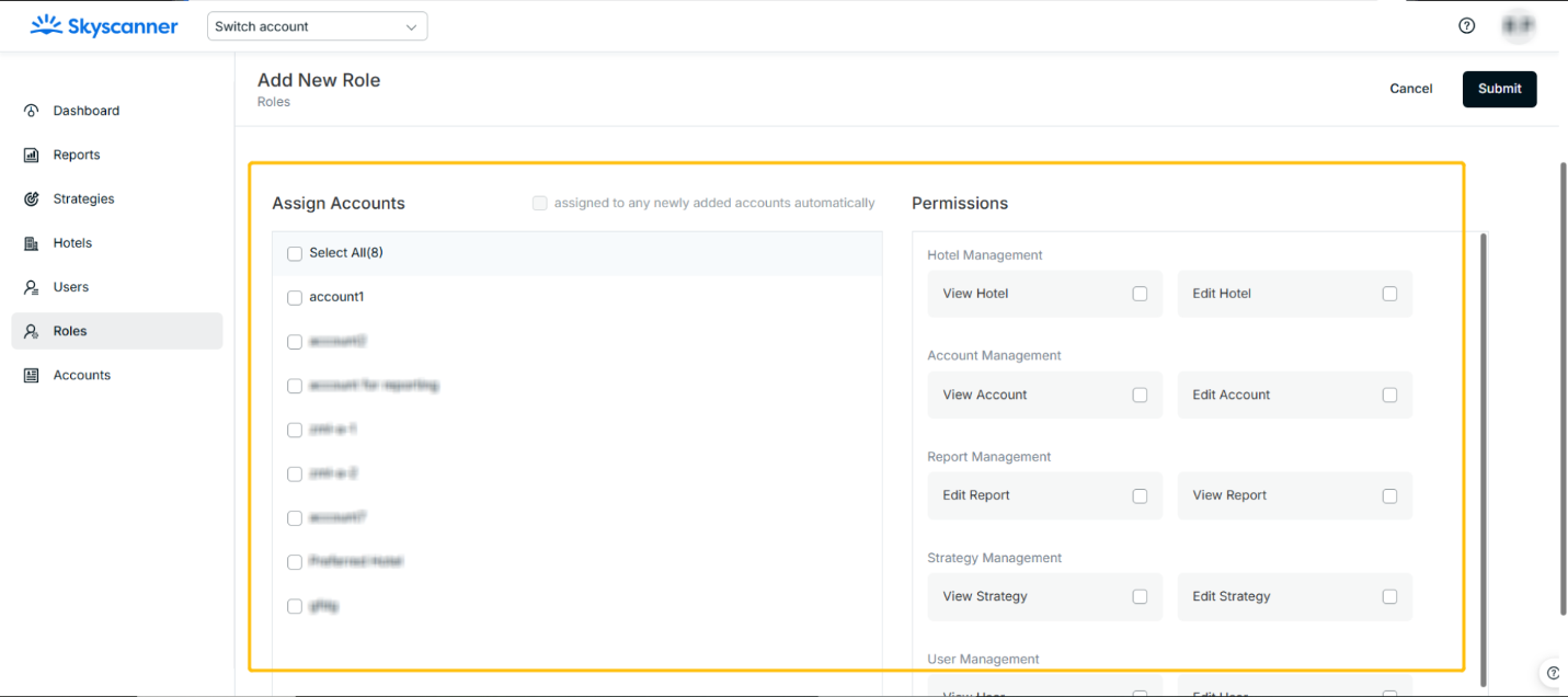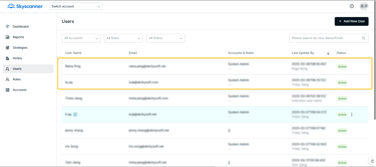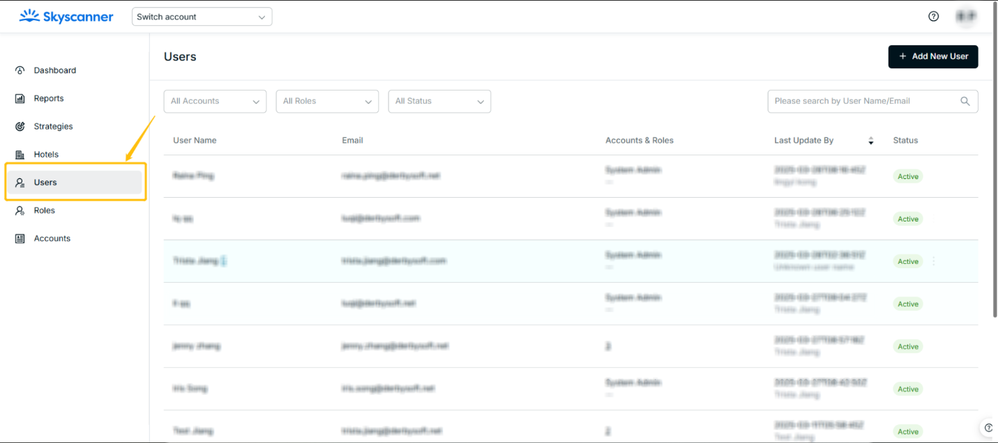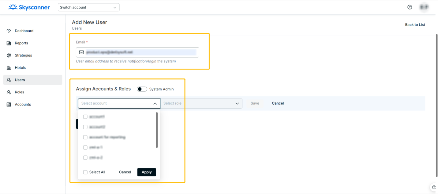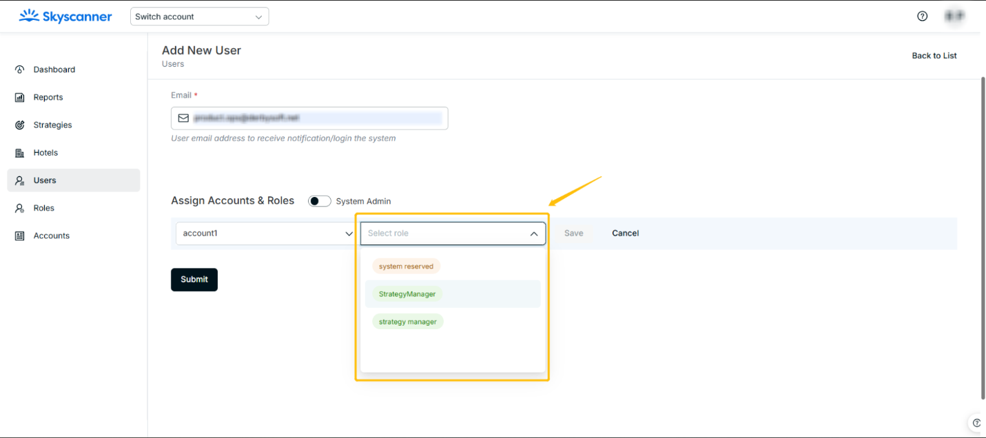 - The MStrategy User Management section allows users to add a new user and assign a role to one or multiple accounts. Right now, the Account Manager and Account Admin are able to manage users, which is not supportable for Strategy Manager and Report User.