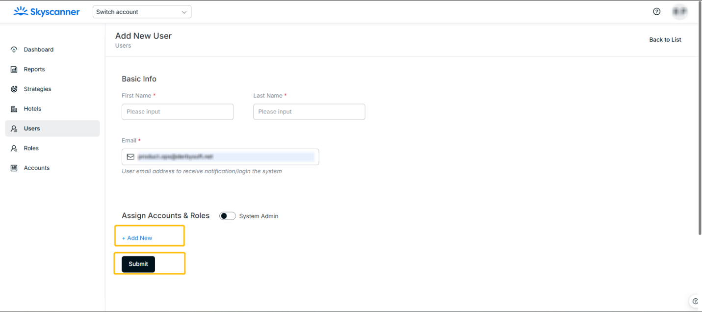 You can edit or delete the account & role mapped, or click Add New to map the user to more accounts.