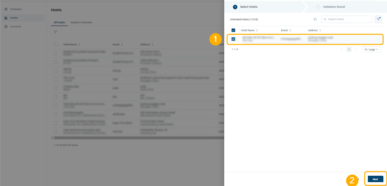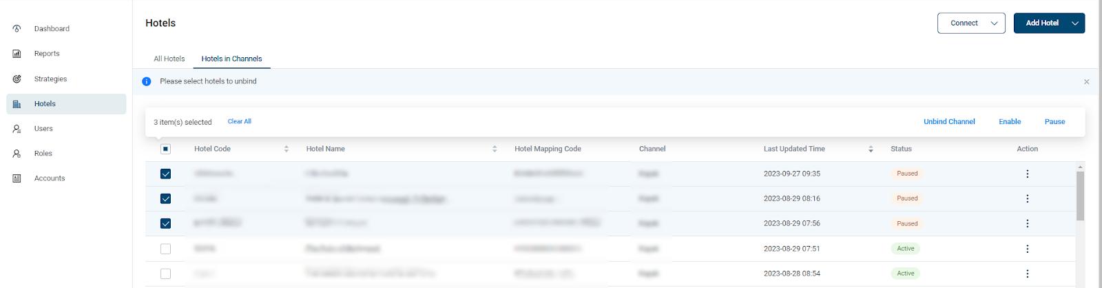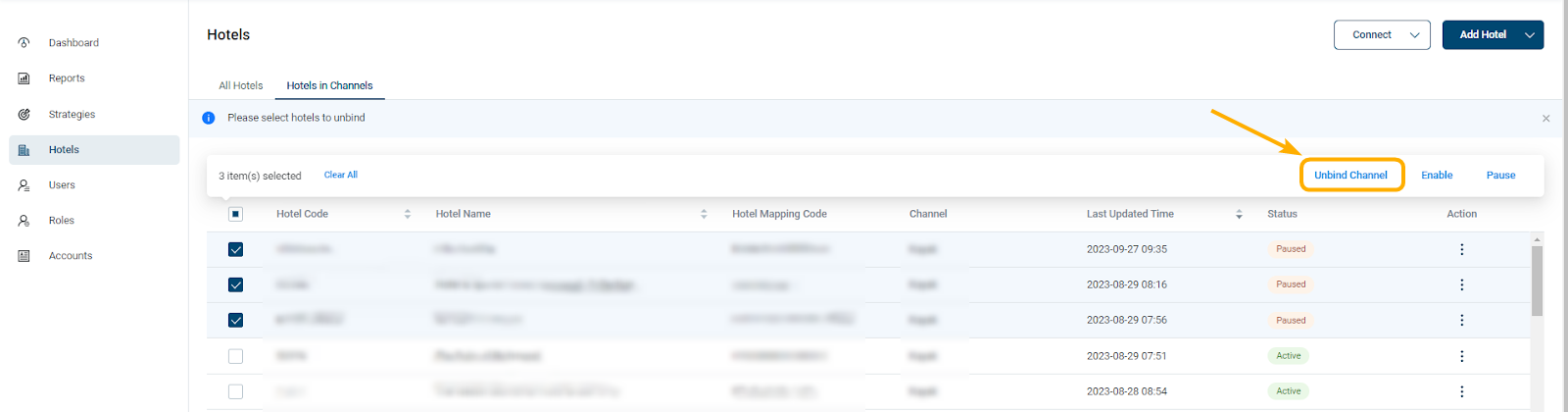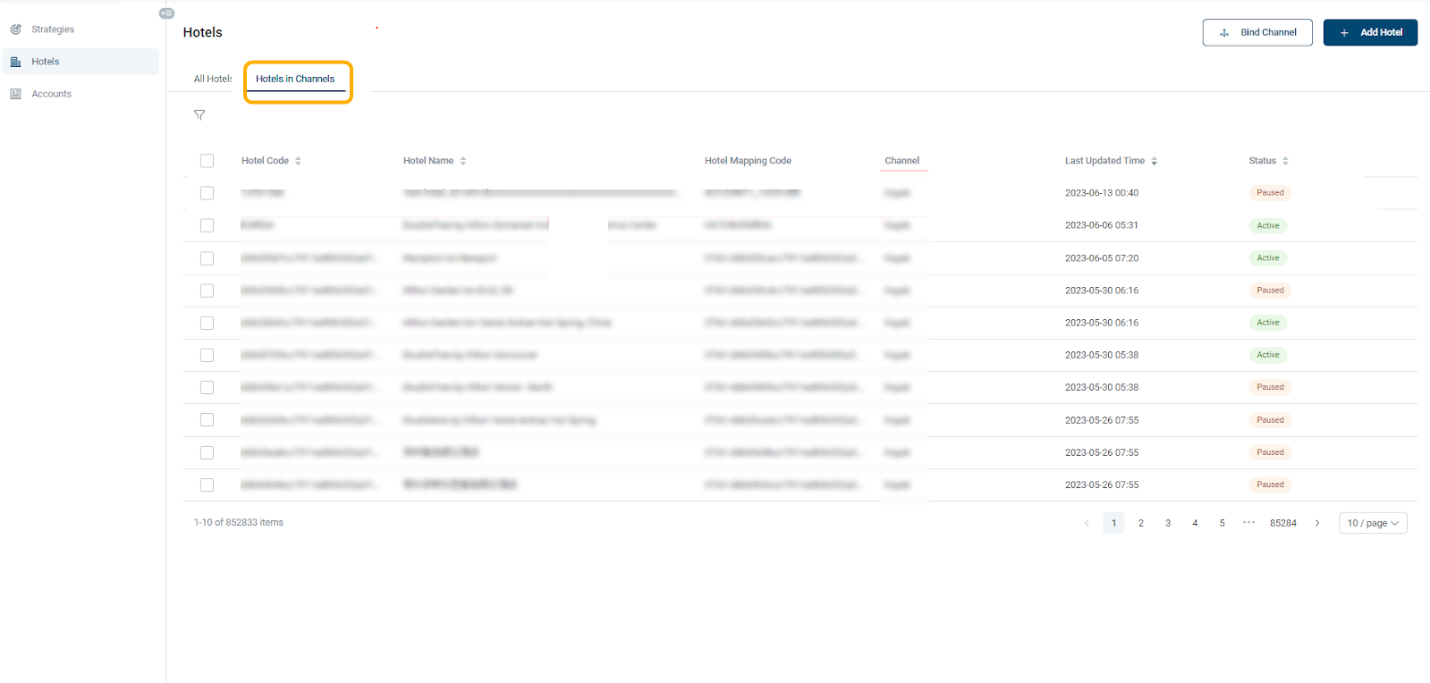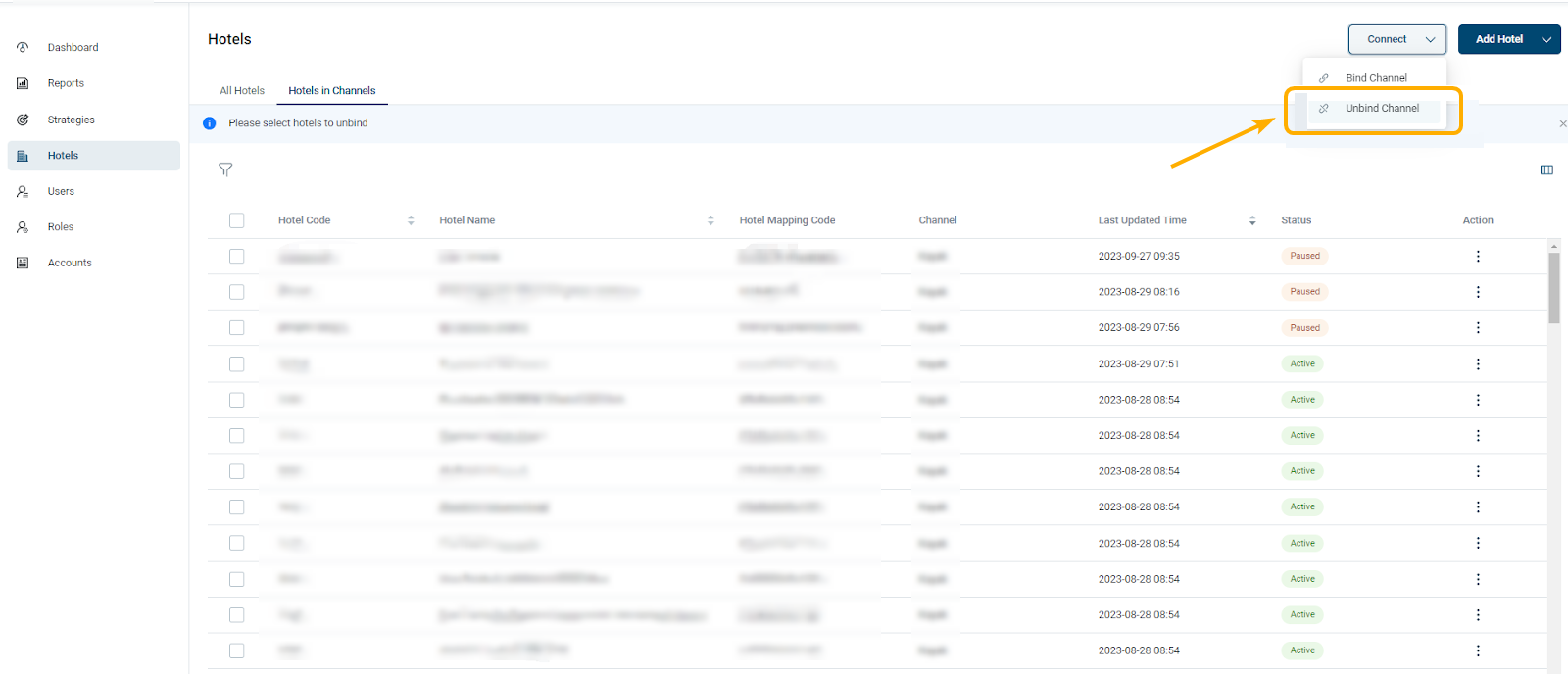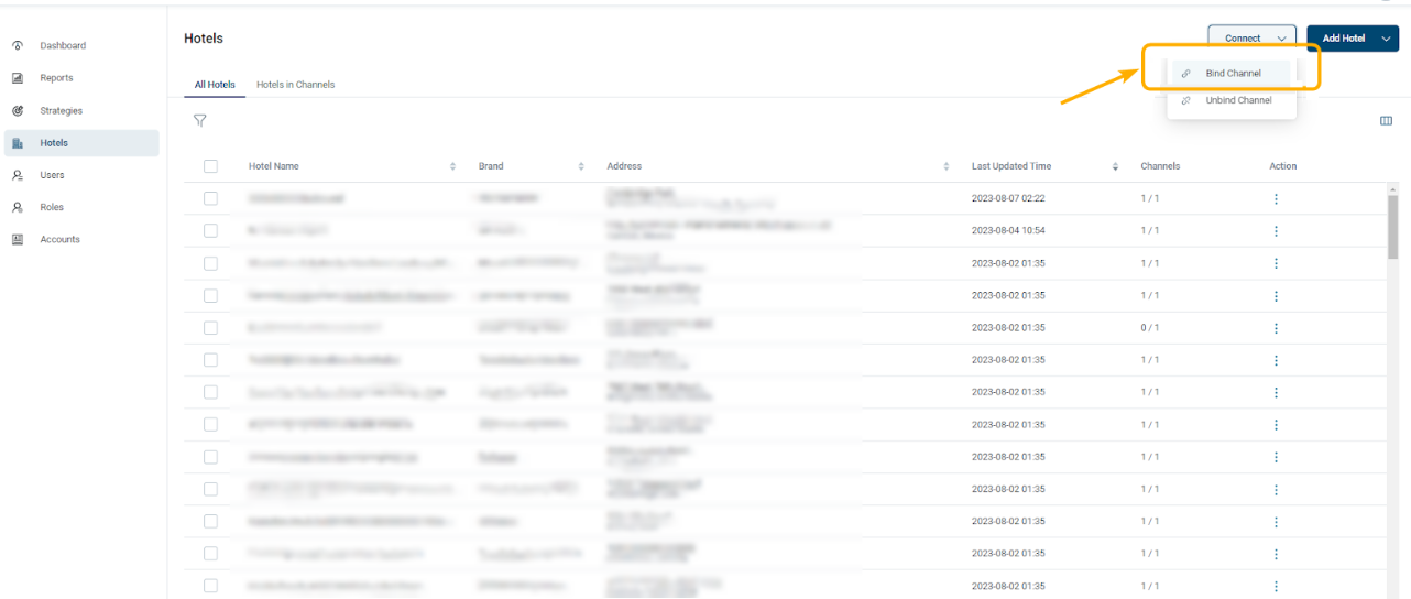 • Users are able to unbind the hotels which are not included in a strategy from a bidding channel with the following steps: