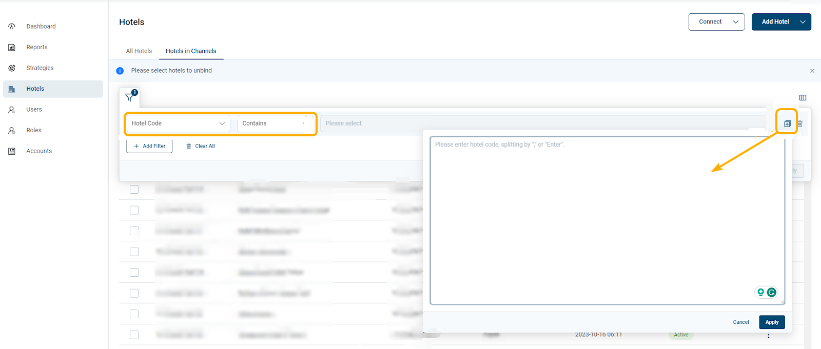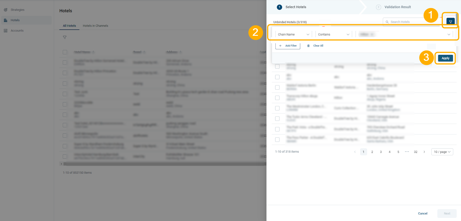 • You can filter the unbound hotels by filtering the condition and clicking Apply.