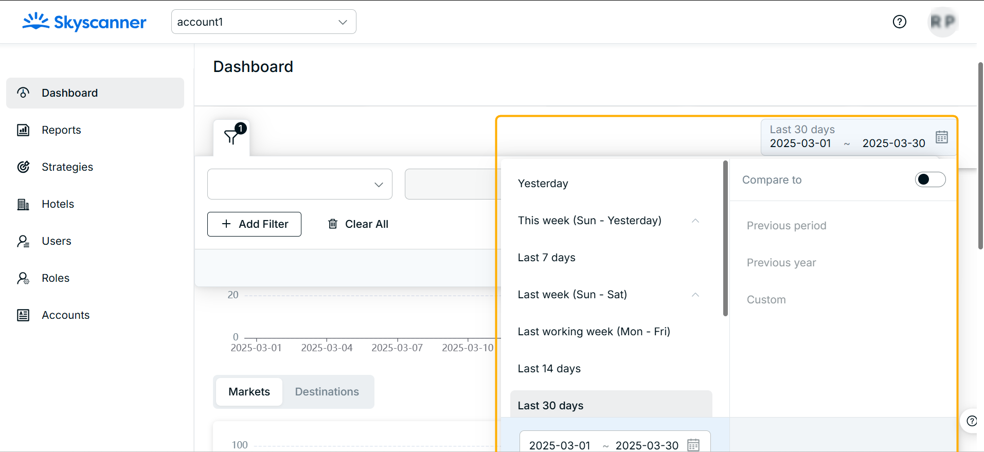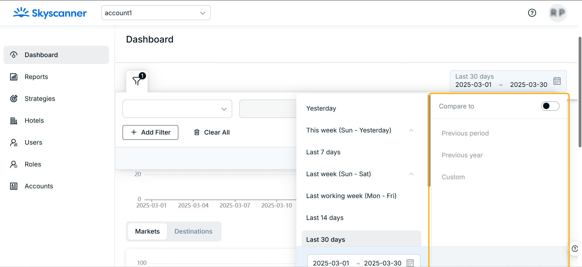 Compare: You can toggle on the Compare to to enable the performance data comparison.
